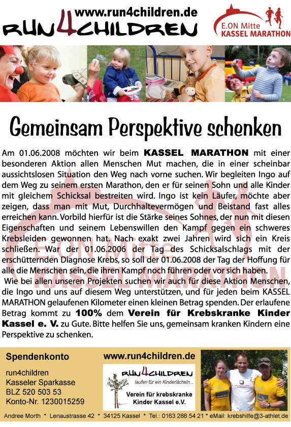 Am 01.06.2008 möchten wir beim KASSEL MARATHON mit einer besonderen Aktion allen Menschen Mut machen, die in einer scheinbar aussichtslosen Situation den Weg nach vorne suchen. Wir begleiten Ingo auf dem Weg zu seinem ersten Marathon, den er für seinen Sohn und alle Kinder mit gleichem Schicksal bestreiten wird. Ingo ist kein Läufer, möchte aber zeigen, dass man mit Mut, Durchhaltevermögen und Beistand fast alles erreichen kann. Vorbild hierfür ist die Stärke seines Sohnes, der nun mit diesen Eigenschaften und seinem Lebenswillen den Kampf gegen ein schweres Krebsleiden gewonnen hat. Nach exakt zwei Jahren wird sich ein Kreis schließen. War der 01.06.2006 der Tag des Schicksalschlags mit der erschütternden Diagnose Krebs, so soll der 01.06.2008 der Tag der Hoffung für alle die Menschen sein, die ihren Kampf noch führen oder vor sich haben. Wie bei allen unseren Projekten suchen wir auch für diese Aktion Menschen, die Ingo und uns auf diesem Weg unterstützen, und für jeden beim KASSEL MARATHON gelaufenen Kilometer einen kleinen Betrag spenden. Der erlaufene Betrag kommt zu 100% dem Verein für Krebskranke Kinder Kassel e. V. zu Gute. Bitte helfen Sie uns, gemeinsam kranken Kindern eine Perspektive zu schenken.
