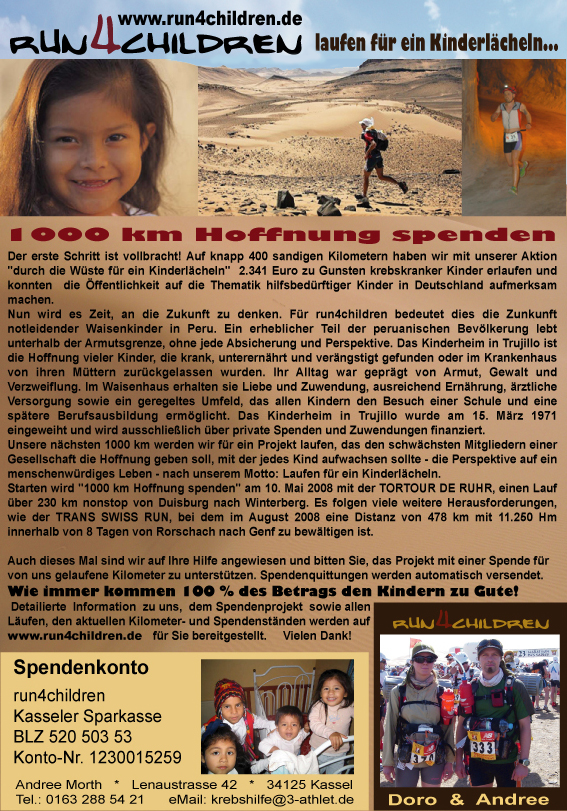 Starten wird "1000 km Hoffnung spenden" am 10. Mai 2008 mit der TORTUR DE RUHR, einen Lauf über 230 km nonstop von Duisburg nach Winterberg. Es folgen viele weitere Herausforderungen, wie der TRANS SWISS RUN, bei dem im August 2008 eine Distanz von 478 km mit 11.250 Hm innerhalb von 8 Tagen von Rorschach nach Genf zu bewältigen ist.