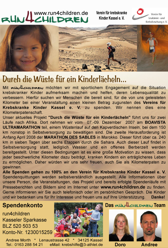 Unser aktuelles Projekt "Durch die Wüste für ein Kinderlächeln" führt uns vom 07.-09. Dezember 2007 nach Boavista, einer Wüsteninsel der Kapverden, und vom 28.03. - 07.04. 2008 in die westmarokkanische Sahara, um auf knapp 400 sandigen Kilometern möglichst viele Spendengelder für krebskranke Kinder zu erlaufen. Wir hoffen auch Sie für dieses Vorhaben begeistern zu können und bitten, uns beim Helfen zu unterstützen. Vielen Dank!